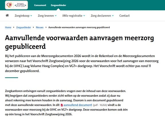 Bij het publiceren van de Meerzorgdocumenten 2026 wordt in de Rekentool en de Meerzorgdocumenten verwezen naar het Voorschrift Zorgtoewijzing 2026 voor de voorwaarden voor het aanvragen van meerzorg bij de LVHC( Laag Volume Hoog Complex) en VG7+ doelgroep. Het Voorschrift wordt echter pas rond 11 december gepubliceerd.
